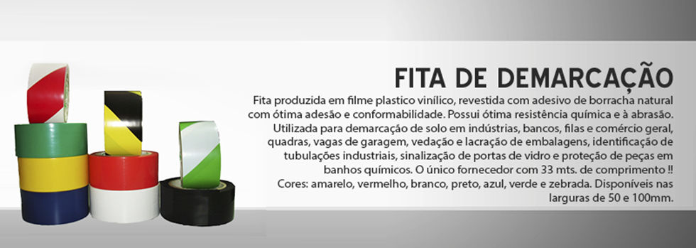 Fita produzida em filme plastico vinílico, revestida com adesivo de borracha natural com ótima adesão e conformabilidade. Possui ótima resistência química e à abrasão. Utilizada para demarcação de solo em indústrias, bancos, filas e comércio geral, quadras, vagas de garagem, vedação e lacração de embalagens, identificação de tubulações industriais, sinalização de portas de vidro e proteção de peças em banhos químicos. O único fornecedor com 33 mts. de comprimento !!
