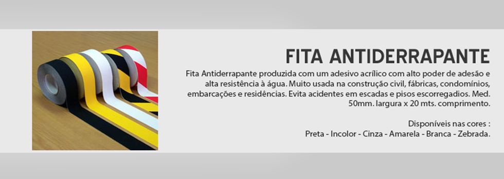 Fita Antiderrapante produzida com um adesivo acrílico com alto poder de adesão e alta resistência à água. Muito usada na construção civil, fábricas, condomínios, embarcações e residências. Evita acidentes em escadas e pisos escorregadios. Med. 50mm. largura x 20 mts. comprimento.