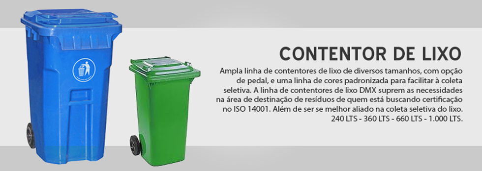 Ampla linha de contentores de lixo de diversos tamanhos, com opção de pedal, e uma linha de cores padronizada para facilitar à coleta seletiva. A linha de contentores de lixo DMX suprem as necessidades na área de destinação de resíduos de quem está buscando certificação no ISO 14001. Além de ser se melhor aliado na coleta seletiva do lixo. Oferecemos uma solução definitiva e profissional ao problema do armazenamento de lixo e à coleta seletiva. Todos os contentores de lixo DMX são equipados com roda de borracha maciça, fazendo com que gere menos barulho e ruído, além de maior durabilidade. Suas tampas tem total vedação 360°, evitando assim a entrada de água e insetos e não permitindo o vazamento do odor interno e impedindo a entrada de animais. Material usado: